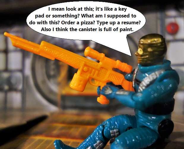 – The Rock Viper rifle, in HOT ORANGE, which came with the Star Brigade Astro-Viper. It was my only version of that rifle throughout childhood, and one of my largest guns, so it was my go-to BFG (besides the blue giant beast of a gun that came with Eco Warriors Flint, but figures could rarely hold that and it was a common thumb-breaker). The best thing about the Rock Viper rifle is the canister and the keypad on the side. The canister makes it seem more like it’s powered by energy, and the keypad made it seem like it could be programmed with multiple blaster functions, like a short burst or a BIG BLAST. It was a common weapon for when I made up my own video games.