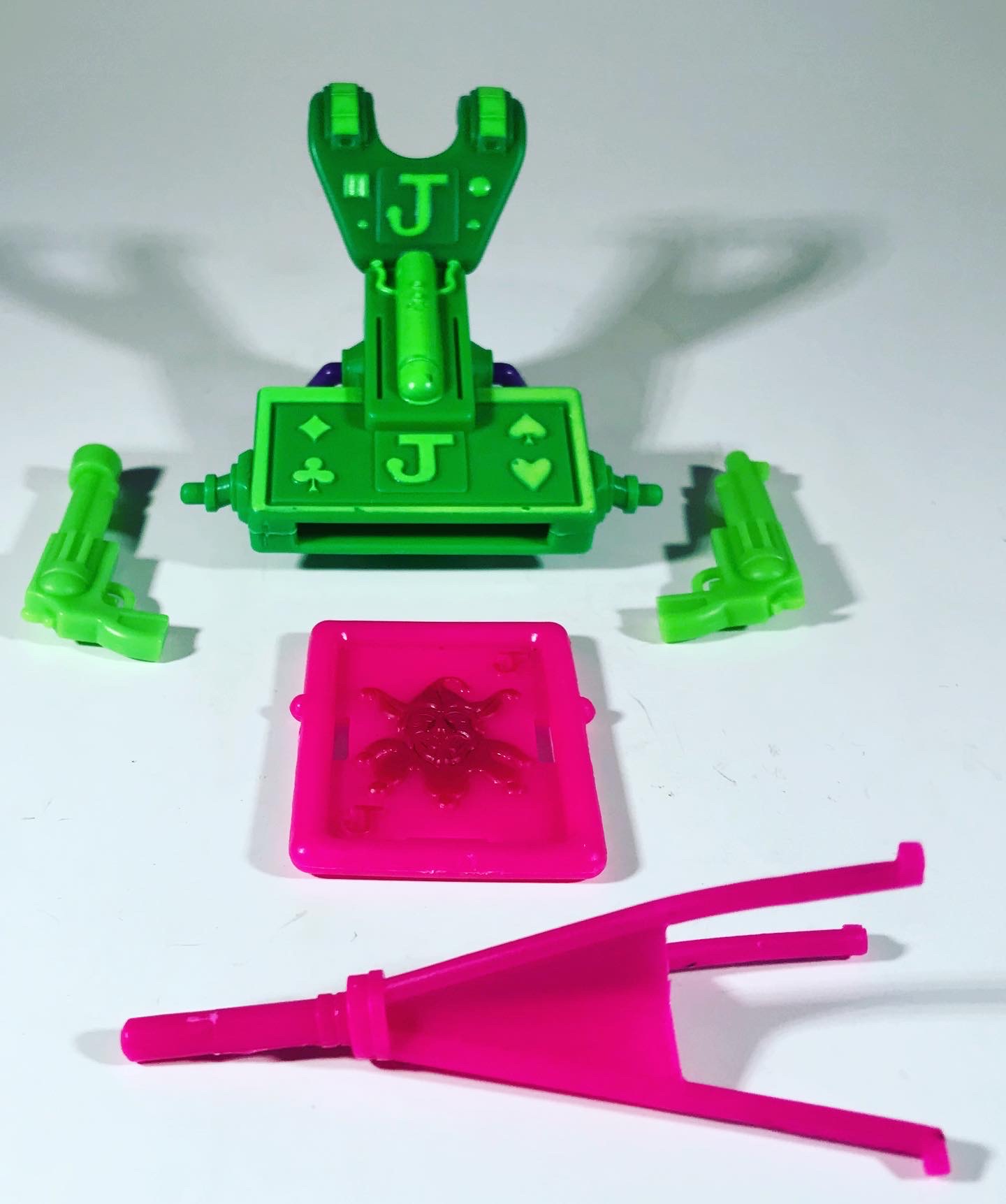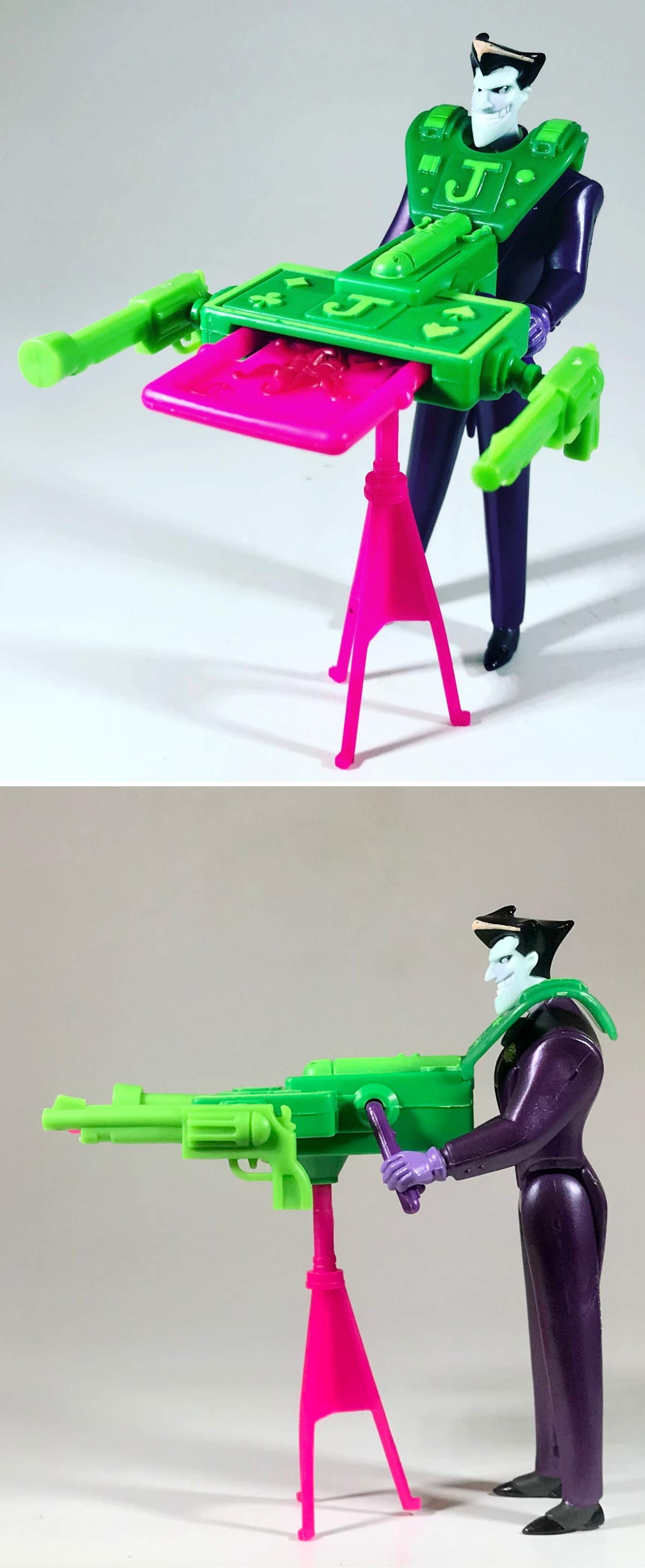 Arkham Assault Joker comes with a green harness piece attached to a launcher, a tripod for the launcher, a playing card themed projectile for the launcher, and two giant green revolvers that attach to the sides of the launcher. It’s kind of a thing.
