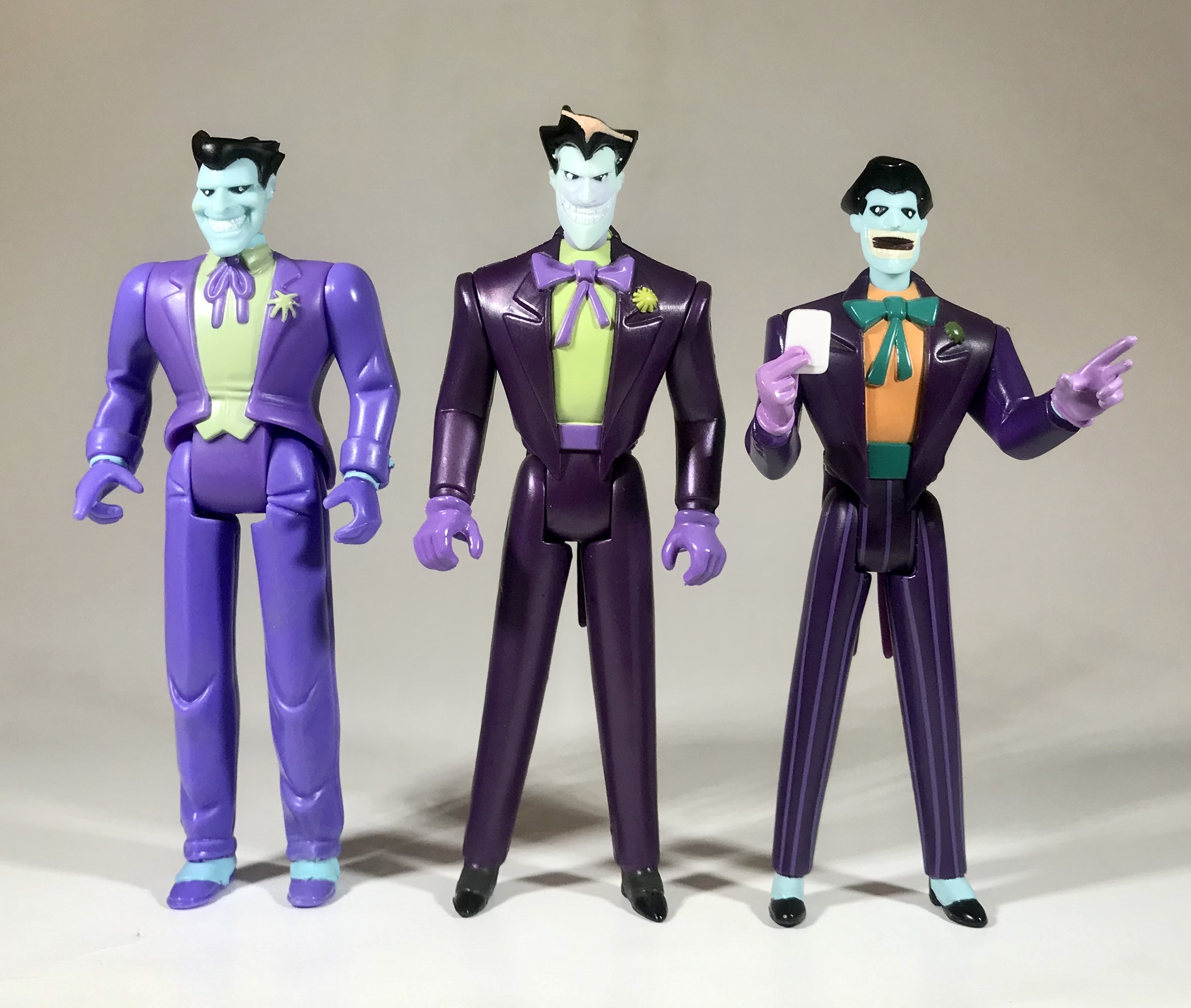 Here he is next to a few other TNBA-style Jokers. The one on the left is from Hasbro’s Alliance of Fear box set (a repaint of the original BTAS Joker) and the one on the left is from Mattel’s early Batman Animated line, circa 2003 or so: