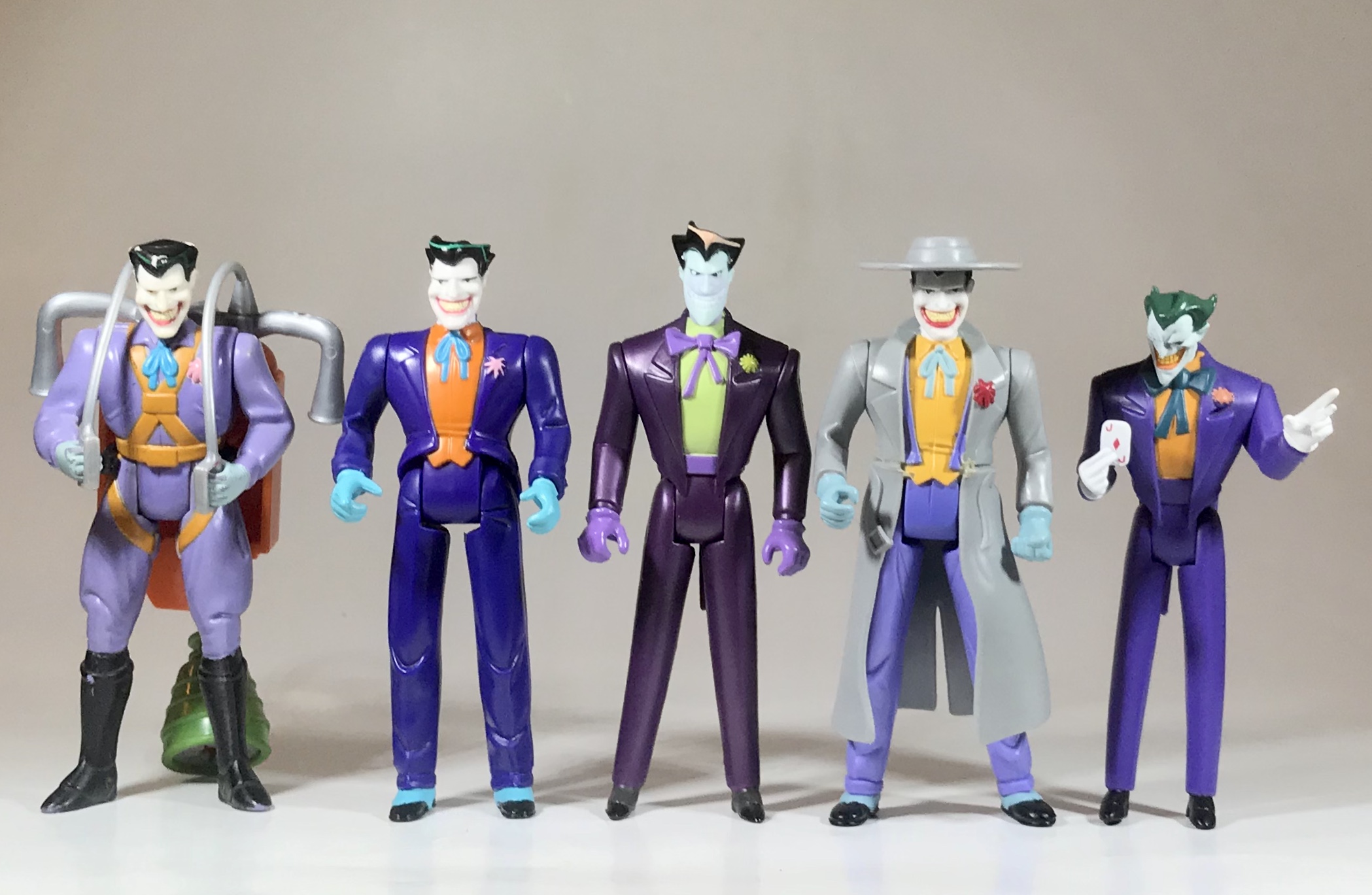 And here he is with another wide array of Jokers– Jetpack Joker (Mask of the Phantasm), Joker from the 1997 Rogues Gallery box set, Machine Gun Joker, and a BTAS style Joker from Mattel’s Justice League Unlimited line: