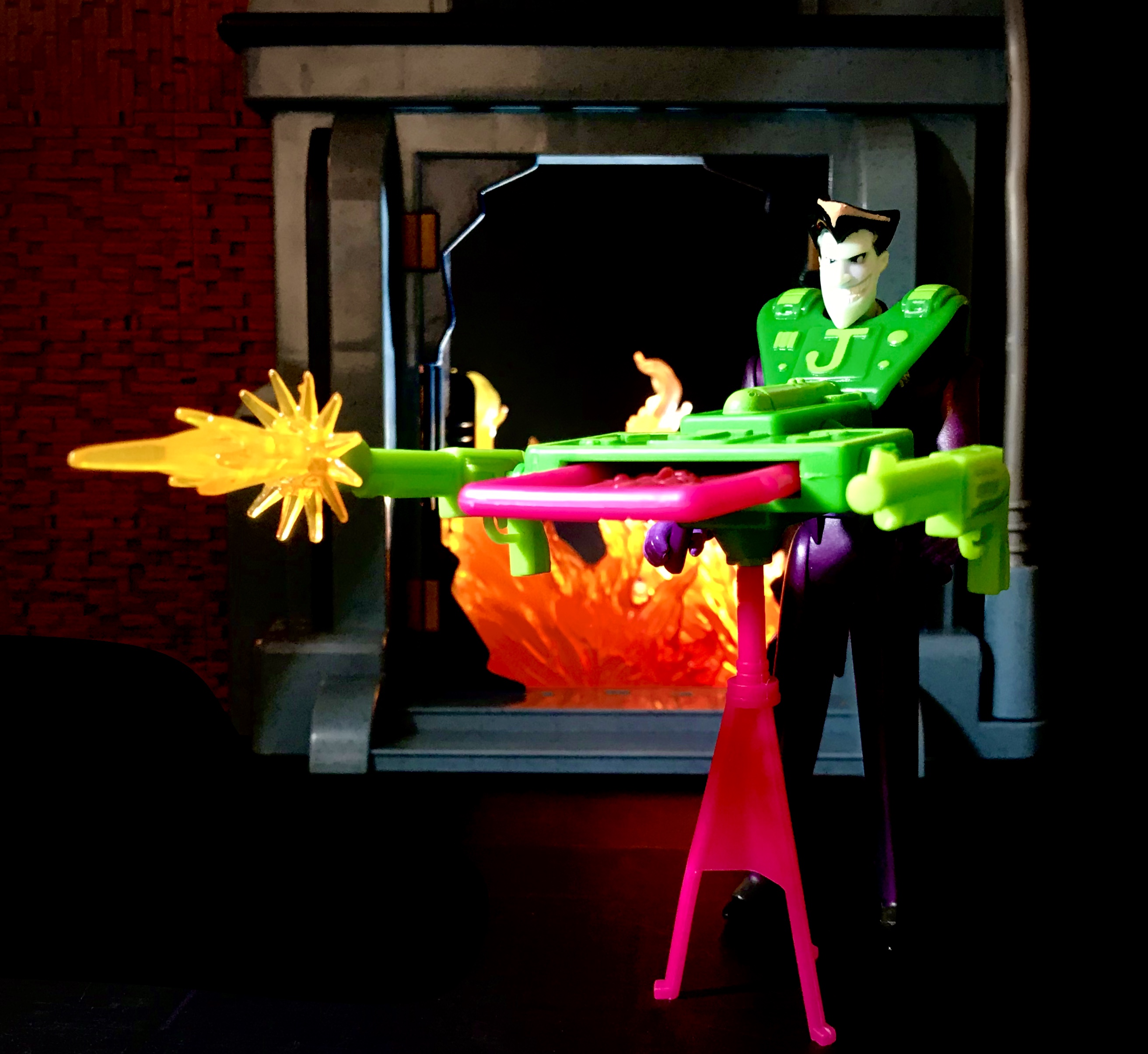 The green revolvers peg onto the side of the launcher to add extra firepower. The figure technically can hold the revolvers in his hands, but his grip is awkward and they’re too big even for the Clown Prince of Pistols.