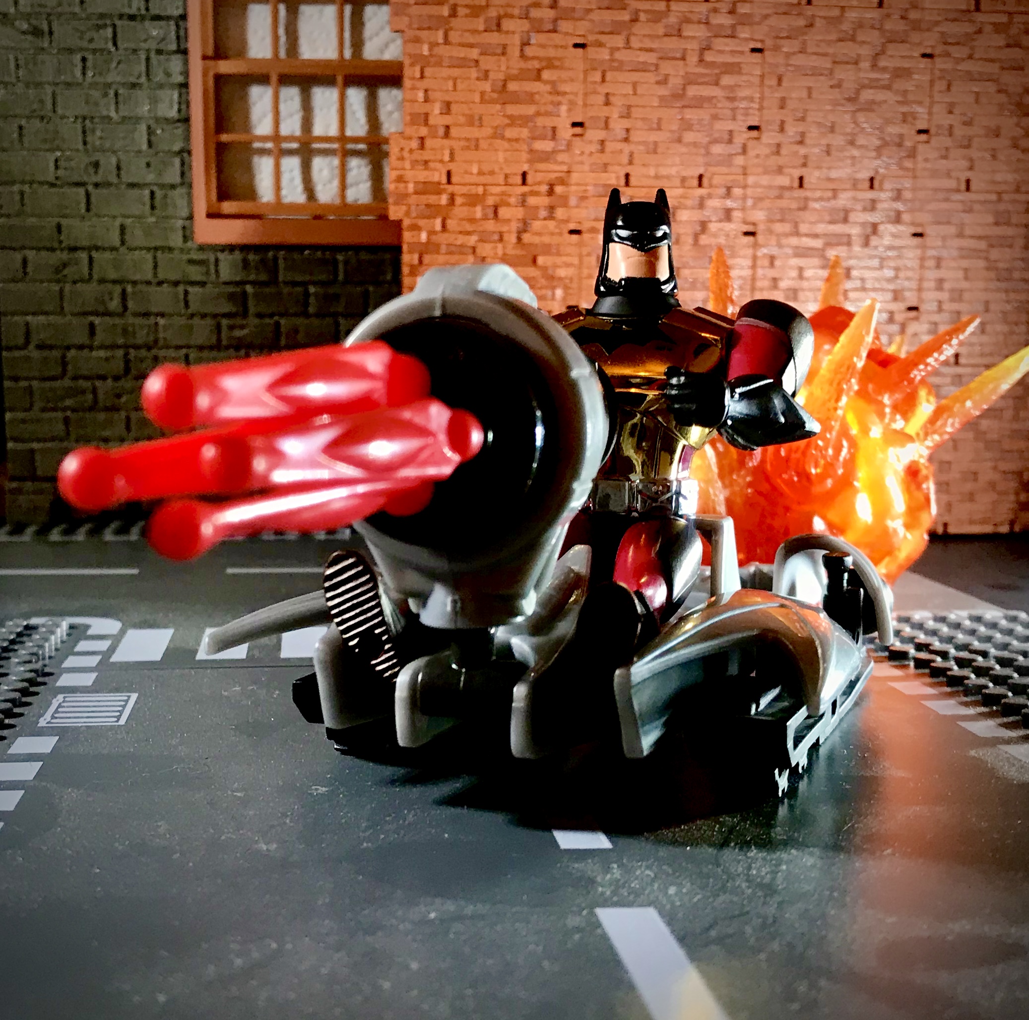 Golden Armor Batman comes with his vehicle/cape, a giant missile launcher that clips onto the cape, four red missiles, and two “hand weapons” that double as skis/treads for the vehicle.