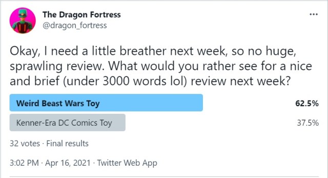 A couple weeks ago, I ran a Twitter poll asking my readers what they’d rather see for my next review– a “weird” Beast Wars toy or a Kenner-style DC toy. The BW figure won. Thanks to all 32 of you who voted.