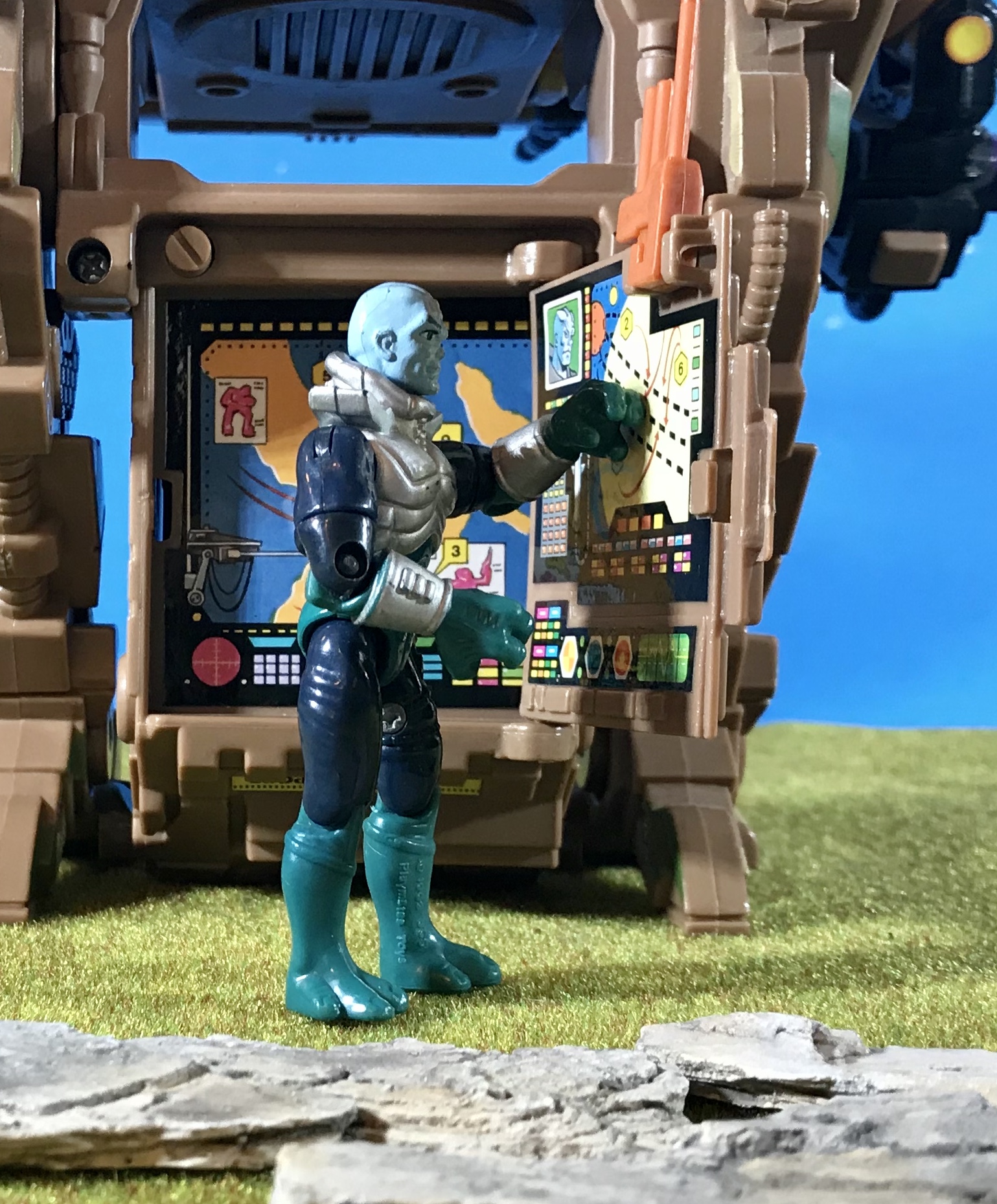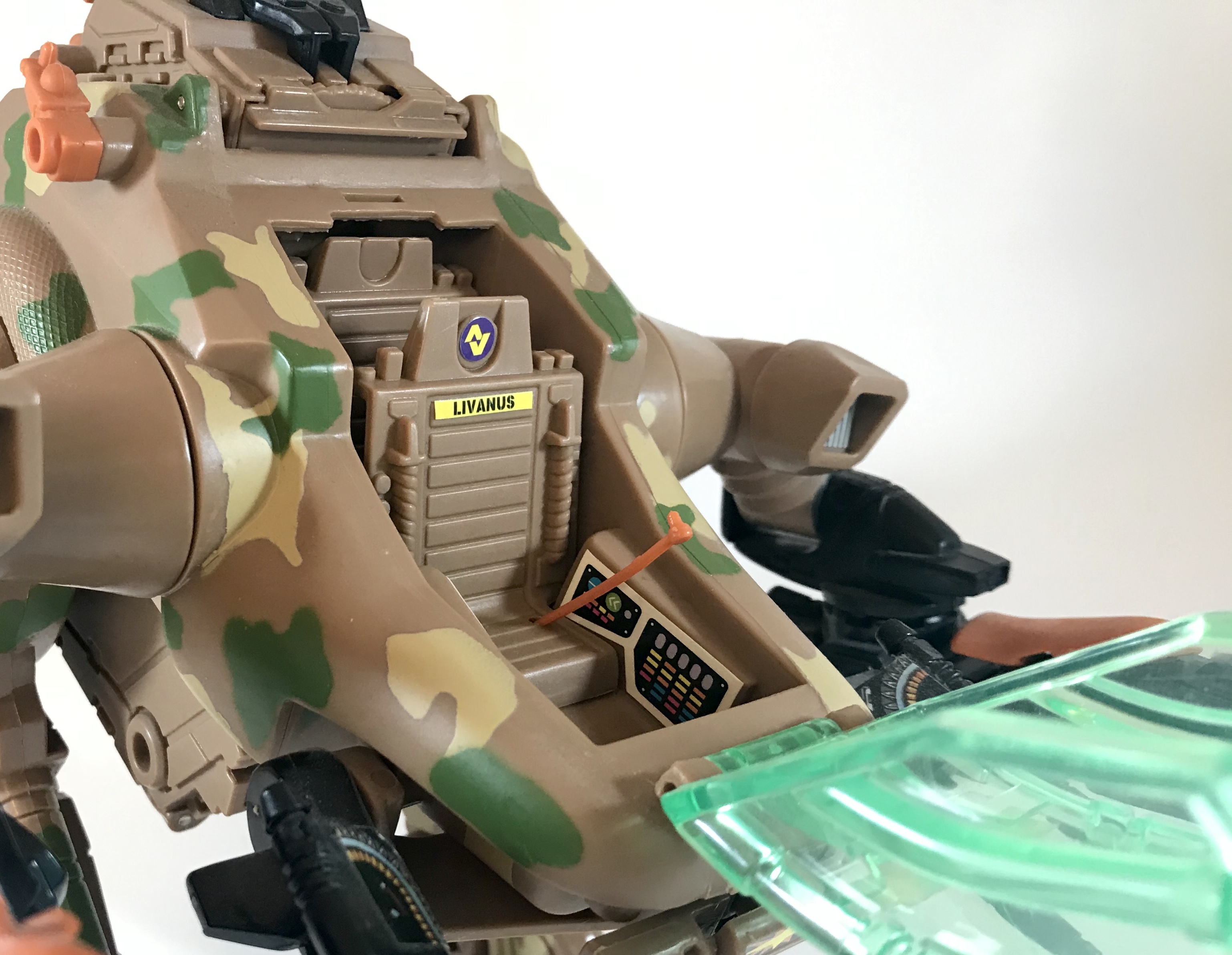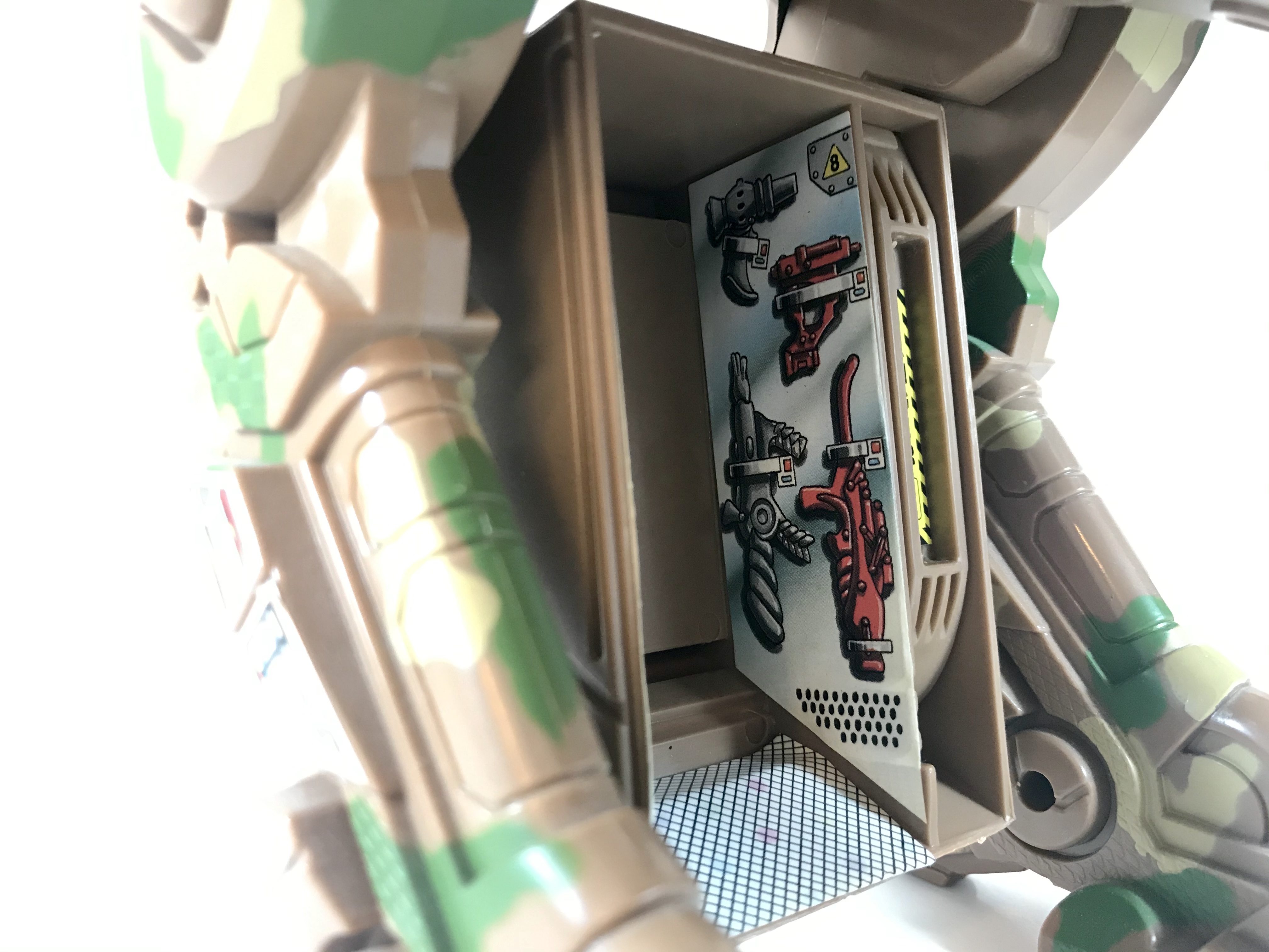 The troop transport compartment serves a few purposes. It holds a single troop, obviously. But once your troop has been transported, this little cubby-hole becomes a “Hidden Battlefield Command Post,” complete with some neat control panel and weapon rack stickers. I absolutely love this feature, and it gives the toy even more play value. This E-Frame can be either a walking engine of destruction or a field headquarters for the Neosapiens.