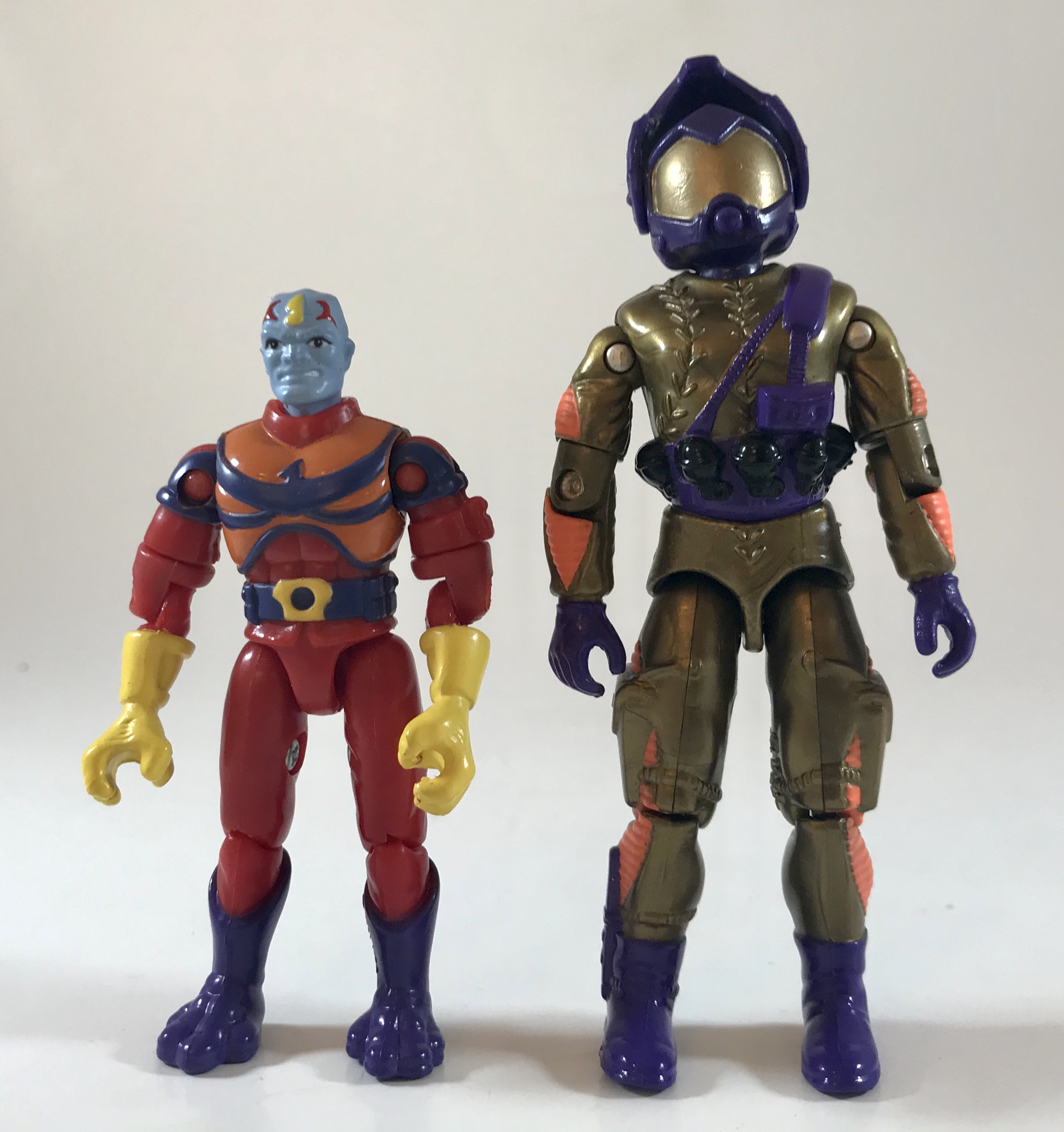 Livanus stands around 3” tall and has similar articulation to an ARAH-era GI Joe, minus any waist/torso movement. His head is also only on a swivel, so it cannot move up or down. Just in case you’ve never seen an Exosquad figure next to a GI Joe figure, here you go: