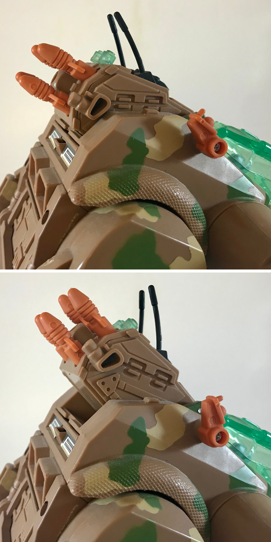 The launcher only raises and lowers slightly, but it’s a great little extra feature. A lot of care went into this toy. There’s some great detail on this piece, too. This launcher is also on a hair-trigger, and it’s even worse than the arm launcher. These four rockets will just straight up shoot you in the face at a moment’s notice, and you have to get the firing dial mechanism in just the right spot for them to click into place at all. I was shot several times while taking photos for this review, and I lost two missiles. Thankfully, I found them the next day. Time has not been kind to this action feature. You could probably repair it if you’re smarter than me, though.