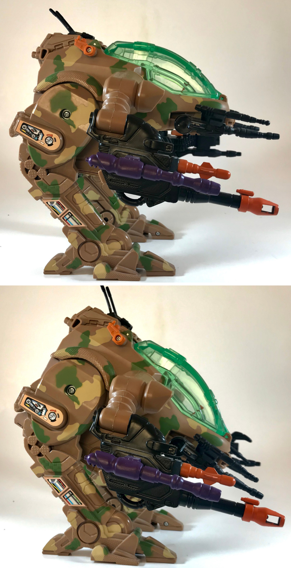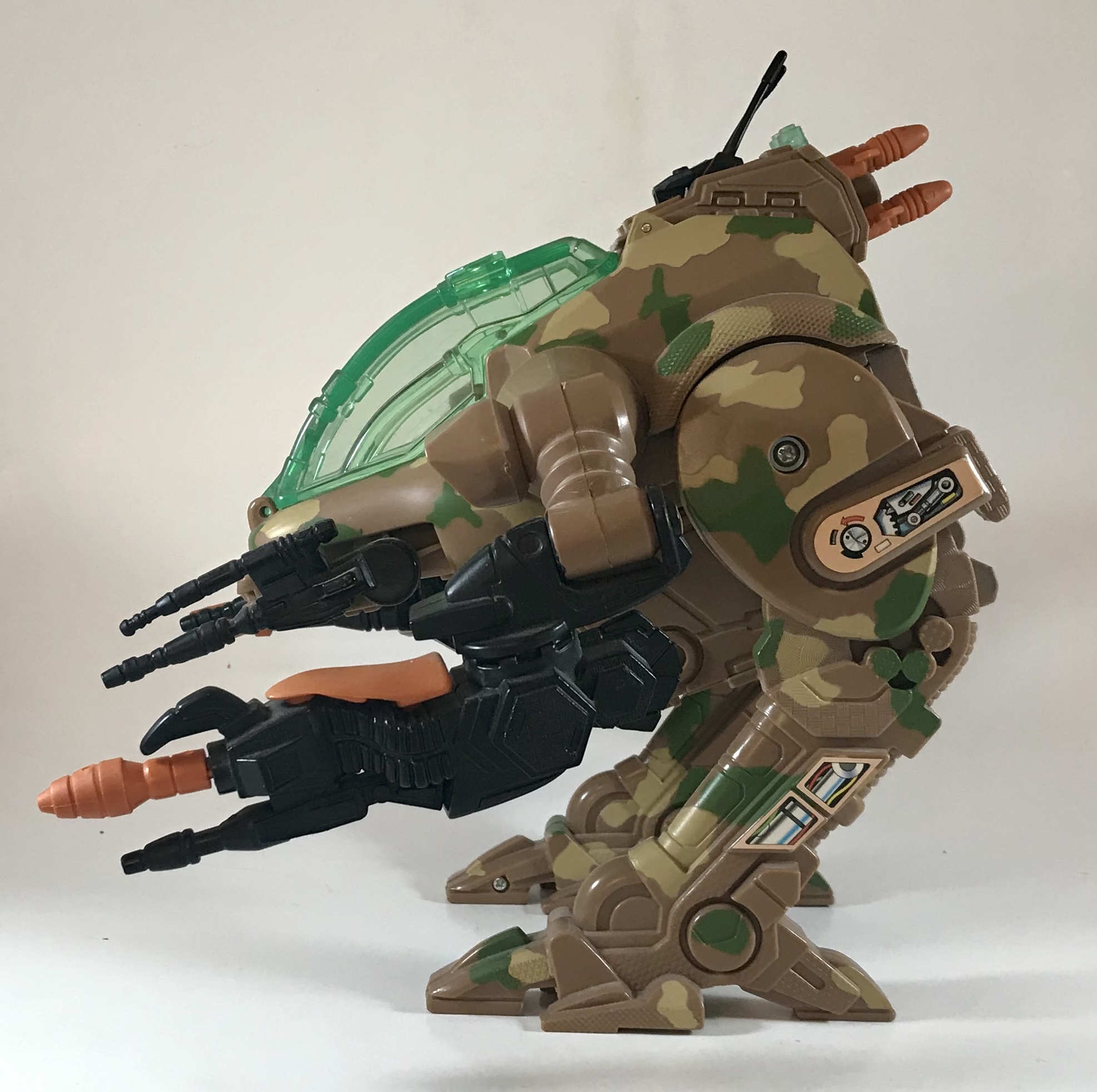 The Troop Transport E-Frame casts an intimidating figure. It is a bipedal mech, but not in the way the smaller Exosquad E-Frames are. It has an almost frog-like appearance, if someone strapped tank armor and several tons of weaponry to a hapless amphibian. It’s mostly cast in light brown plastic with green and beige camouflage paint applications. Many of its parts are cast in brownish-orange or black, with the orange parts denoting where there’s an action feature. The canopy glass is a beautiful transparent green, and stands out from the rest of the toy while still looking cohesive with its color scheme.
