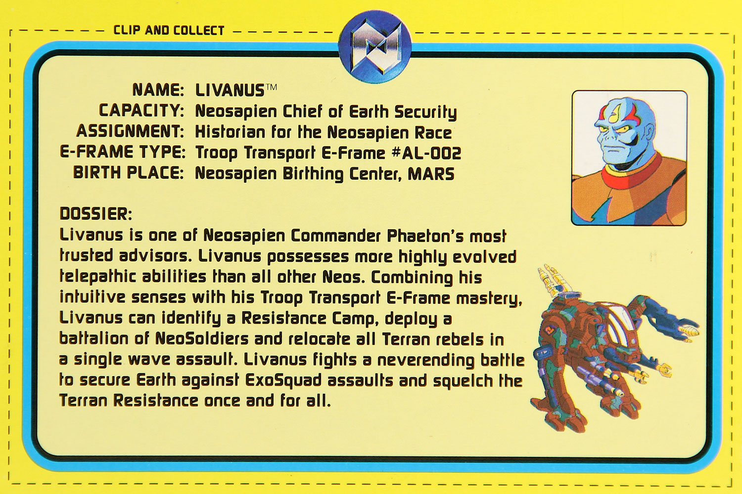 Livanus was pretty much a non-entity in the cartoon– I think he appeared in only one episode, as one of Phaeton’s advisors. His file card makes him out to be extra psychic, I guess to make up for a lack of personality or cartoon appearances. He is the only Exosquad character to have the word “anus” in his name, though, so that earns him some extra points from me.
