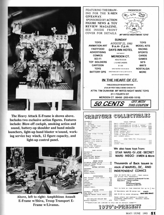 Well, it turns out there was one planned. But there was a problem– the Heavy Attack E-Frame was pretty much just a Mad Cat (or Timber Wolf) from the MechWarrior/BattleTech franchise with just a couple little embellishments. At that point, the lines between Exosquad, Robotech, and BattleTech were pretty blurred– the Robotech Destroids originated in BattleTech, and were released under the Robotech sub-line in the Exosquad toy line. So there was some cross pollination. But Playmates just making their own Mad Cat without licensing approval was probably a bridge too far, so the toy never came out. Exosquad was kind of on its last legs at that point anyway, though. I’m not sure on the whole story, but I’m guessing legal action would have been taken at some point, even if the toy line hadn’t died.