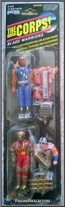 Unlike most Corps! figures, Lightning Mobutu didn’t see heavy reuse. He was repainted in 1994 in the “Blade Warriors” series as one of the Red Renegades. The figure recolored Lightning Mobutu in red and gold, rendered his accessories in brittle gold plastic, and gave him roller blades to peg into his feet. Check out the figure below, courtesy of Figure Realm.