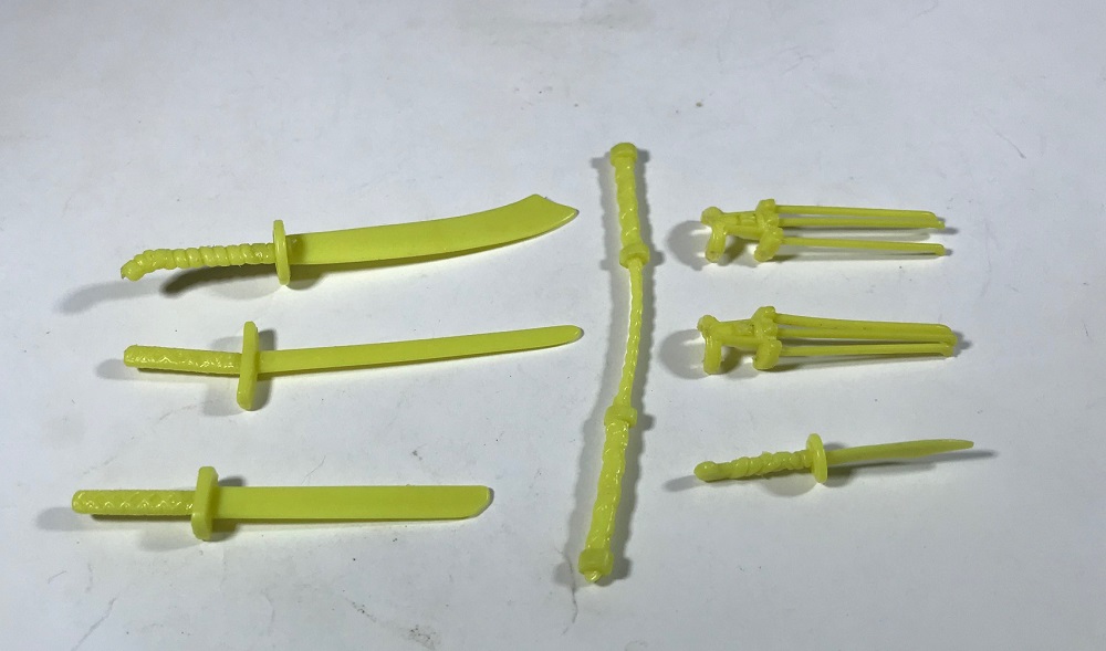 And yep! The claw originally came with Storm Shadow v2 and was used a bunch in 93. Then, in 94, it got retooled for the worse (it used a handle instead of clipping onto the arm) for Shadow Ninjas. Then the original version got used many times in the 00s Repaint Era. Ninja Force and Street Fighter reused a lot of accessories in 1993, but they did produce a few new molds as well, such as the not-scimitar and the dagger.