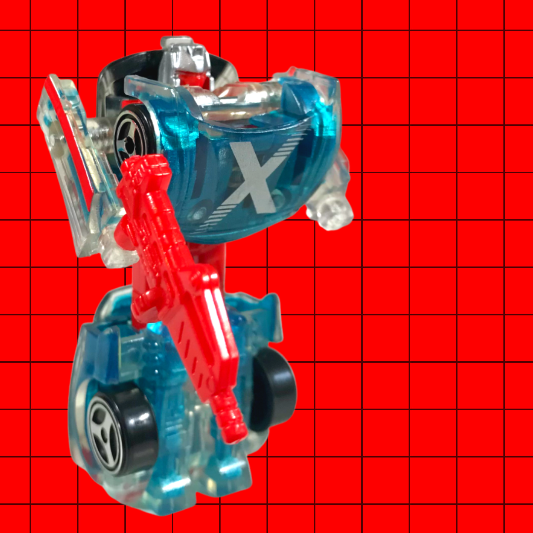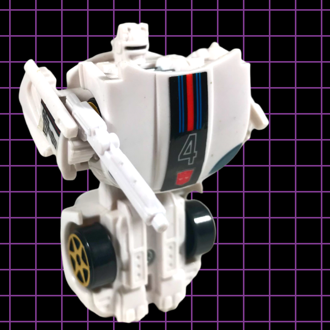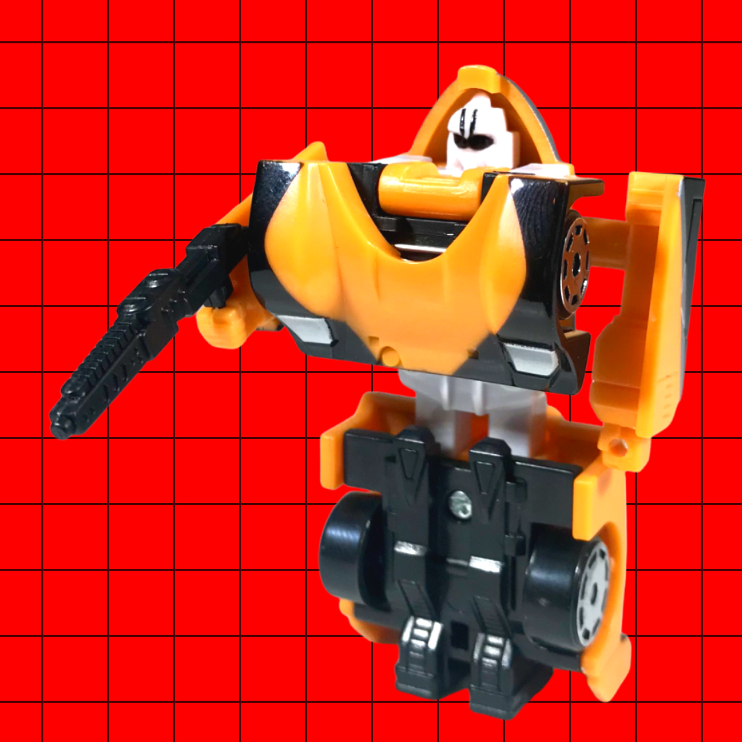So, what is a Go-Bot or a Spychanger anyway? Well, they’re basic and simple little Transformers. In vehicle mode, they’re exactly the same size as a Hot Wheels car– 1:64 scale. In robot mode, most of them are about the size of a classic Generation 1 (or 2) Mini-Vehicle. They feature through-axle construction for fast rolling and are compatible with most Hot Wheels or Matchbox race tracks and accessories.