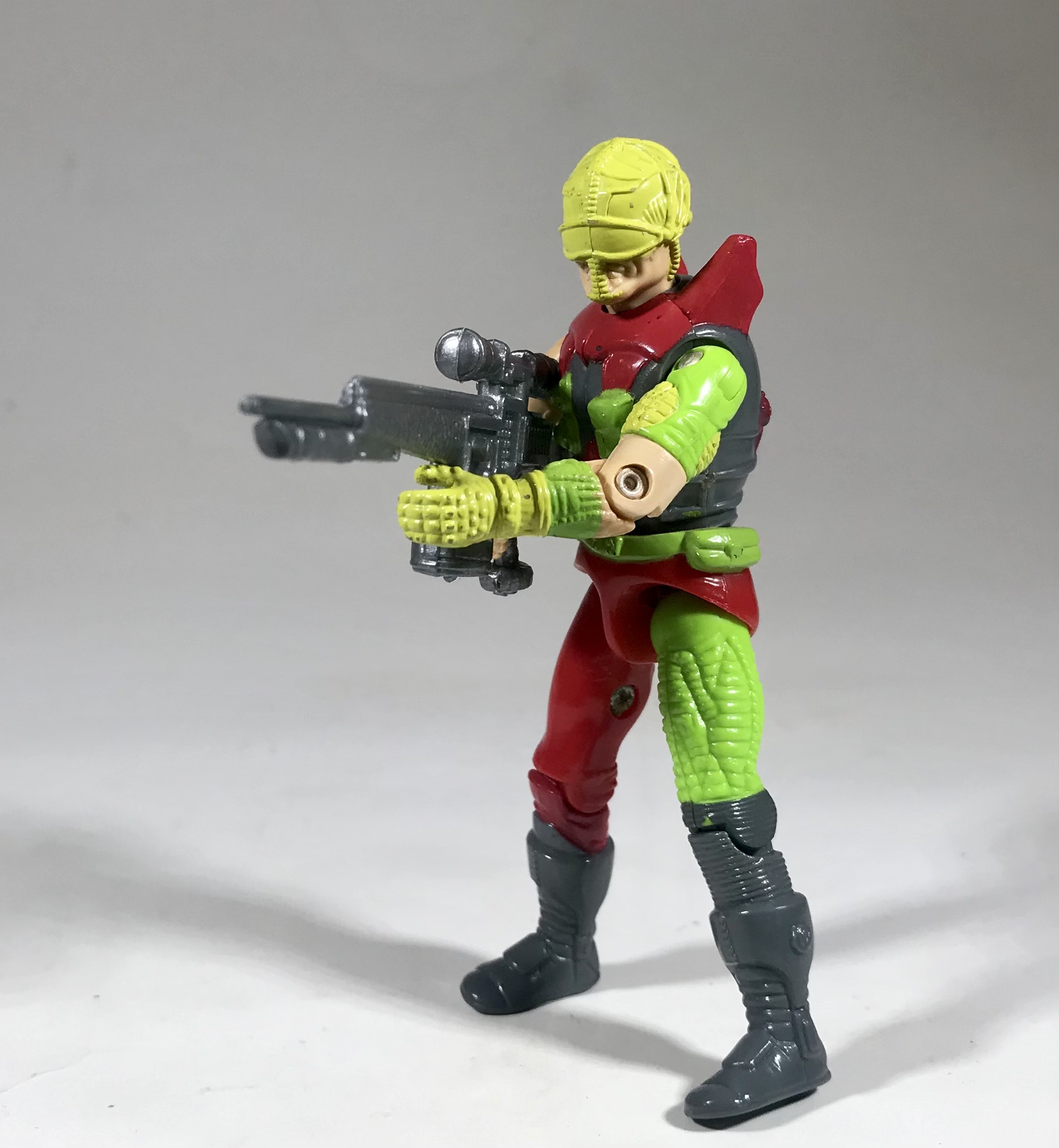 I totally get what you mean about the color scheme. As a fellow noticer of neon nonsense, this one ends up somewhere in the middle between G2 Ramjet (sublime) and Action Master Thundercracker (awful wrapping back around to sublime), feeling both gaudy and incoherent in the way I assume most people feel when they look at all the good stuff 90s Joes had to offer.