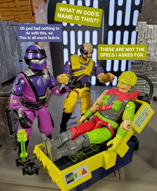 Those qualifications fit my mission statement perfectly, but my opinion on Cyber-Viper may surprise you. Or maybe not. You could just be really good at reading people, or be reading my thoughts through a 5G tower. Usually I only let the government read my mind but ,since you’re doing it for a good cause (a late 30-something’s opinion on an ancient GI Joe toy), we’ll let it slide this time.