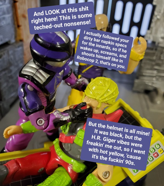 After that, we rarely used the molds to make bio armor, and my friends got in trouble for gunking up their desk with playdoh. I probably only used them once on my own, and after that we just put the molds directly on the figures and pretended the vertical parts at the bottom for covering the missiles were like jet packs, and anyone that wore them did big moon jumps. We frequently just kinda mixed Mega Marines and Star Brigade together because we were cool kids that had seen Aliens and we were wise to their Colonial Marines inspiration going on there. They’d battle Kenner Aliens and Predators too, which we freely mixed in because it was alright for them to be larger scale.