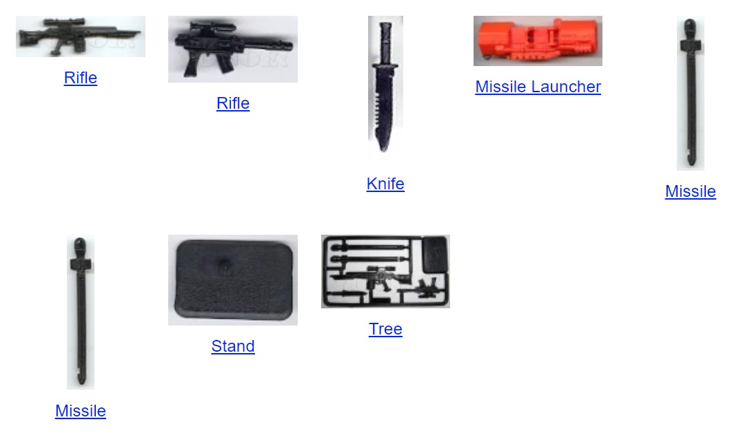 Like almost all 1993 figures, Headhunter Stormtrooper’s core accessories came attached to a plastic sprue or “weapons tree.” The figure included a black (slightly modified) version of 1990 Rock Viper’s rifle, 1992 Destro’s submachine gun in black, a black version of 1988 Shockwave’s knife, two black missiles, a black figure stand, and an orange missile launcher. The image above is a screenshot from YoJoe.com, as I’m missing the figure’s knife and the correct missiles.