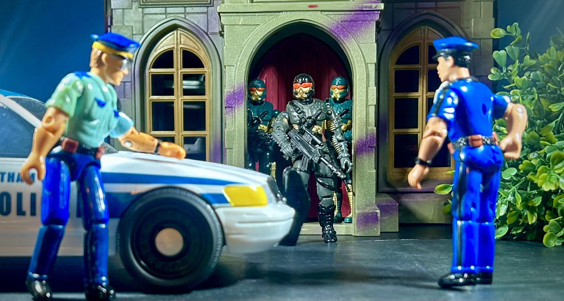 Battle Corps peg warmers they had there. I love your thoughts on the Cobra/Headhunters relationship. I may steal some of that for my own canon, but I also like to keep open the possibility of them getting into fights over turf. This article has also convinced me to look for some Lanard policemen. They would be really useful in photos. (And they look great with your Batman squad car.)
