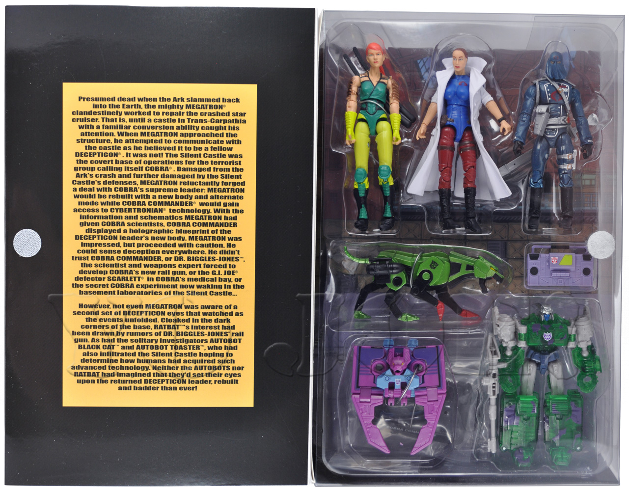 Before this toy, she only had one other figure. In 2017, the GI Joe Collectors’ Club released a joint box set with the Transformers Collectors’ Club. It contained a late-Marvel comics Cobra Commander (which looked very much like every other Modern Era Cobra Commander), a reasonably-okay looking Ninja Force Scarlett, a clear green redeco of 2013 Legends Class Megatron in “holographic” G2 colors,  a redeco of 2014’s Masterpeice Ratbat, along with “accessory figures” of Black Cat and Toaster (whoever the fuck they are).