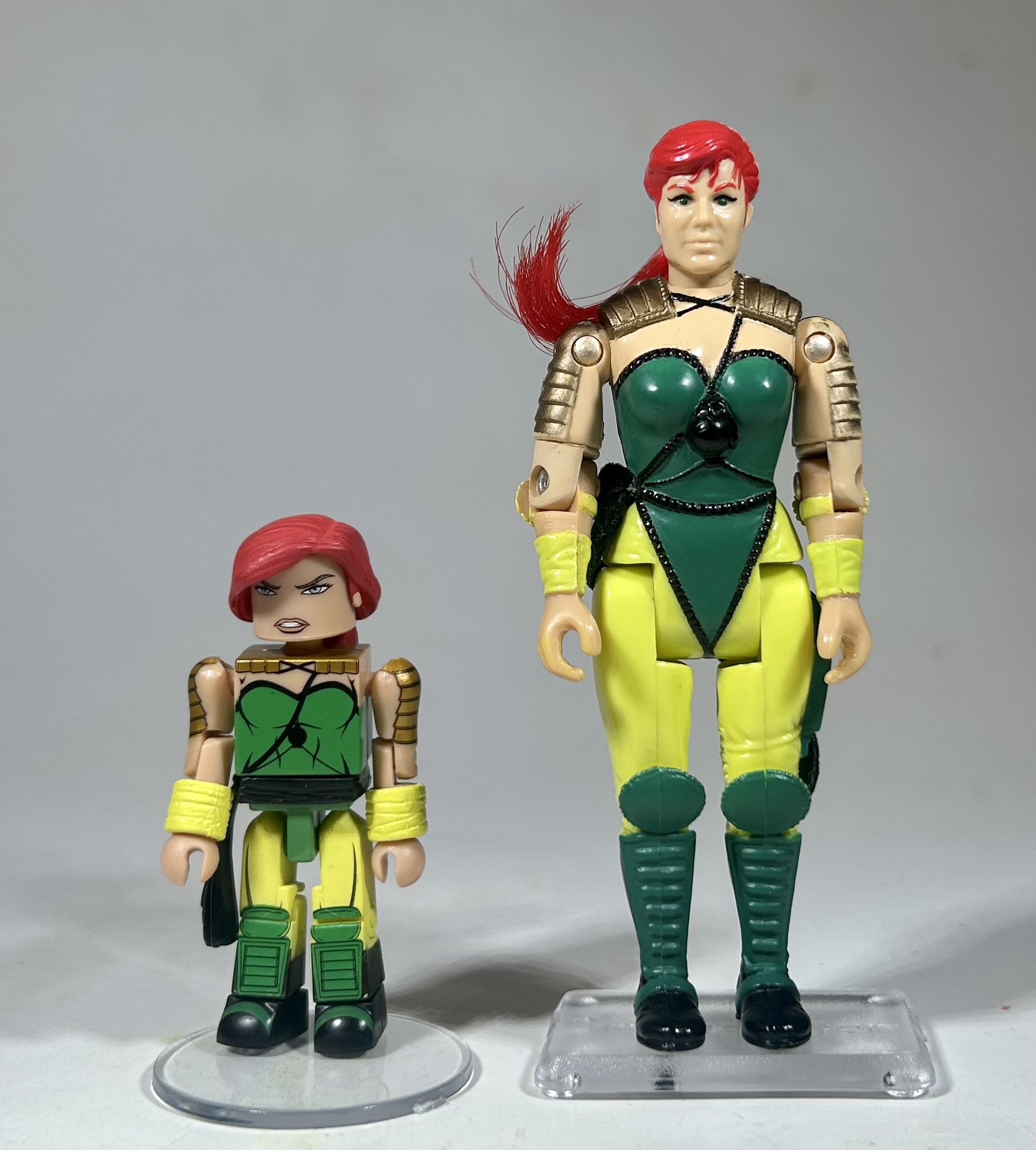 Here’s a comparison with a Kre-O Copperhead figure, a Lego minifigure, and a modern Mega Construx Evil-Lyn, just so you can get a handle on their shape and size.