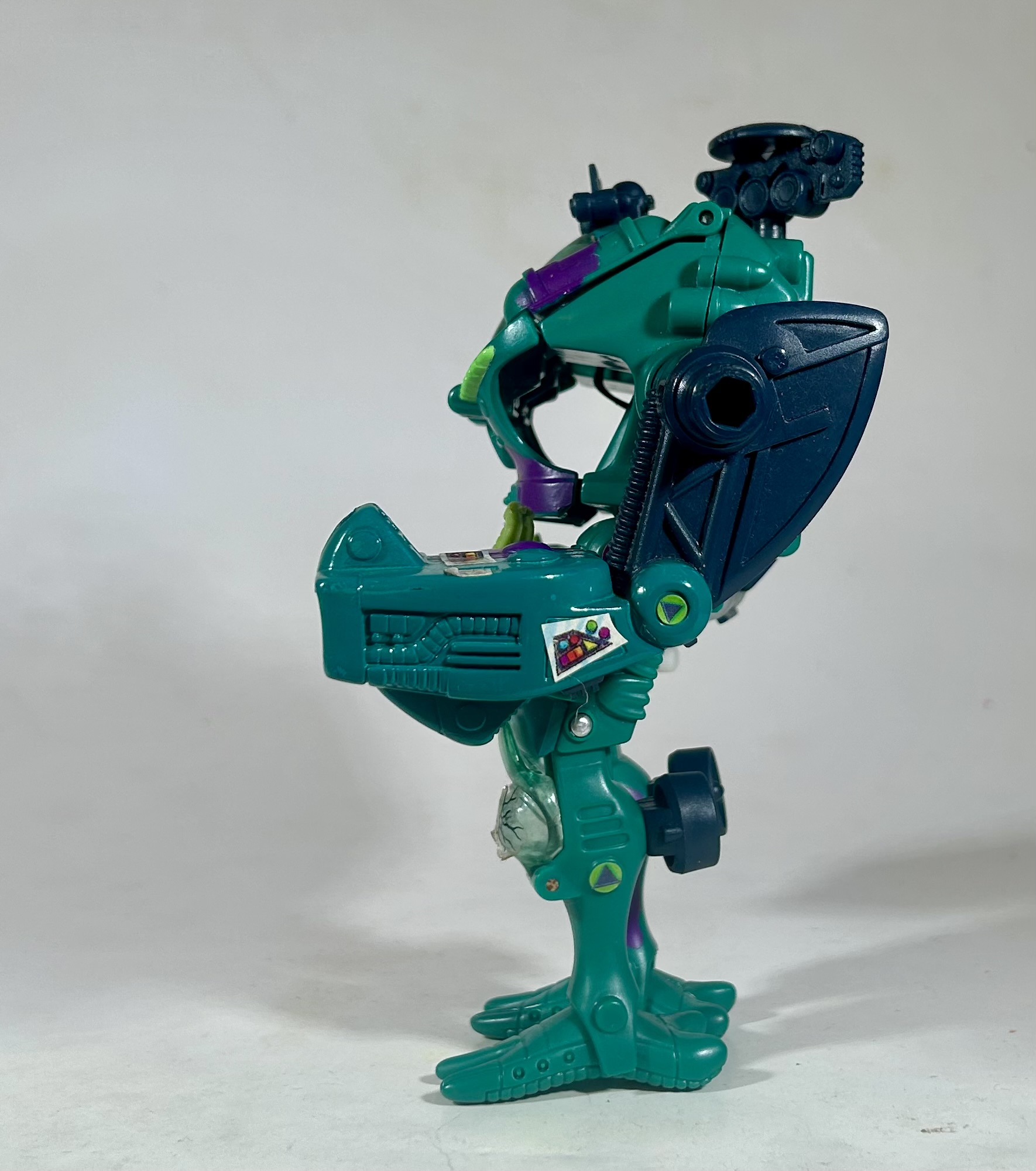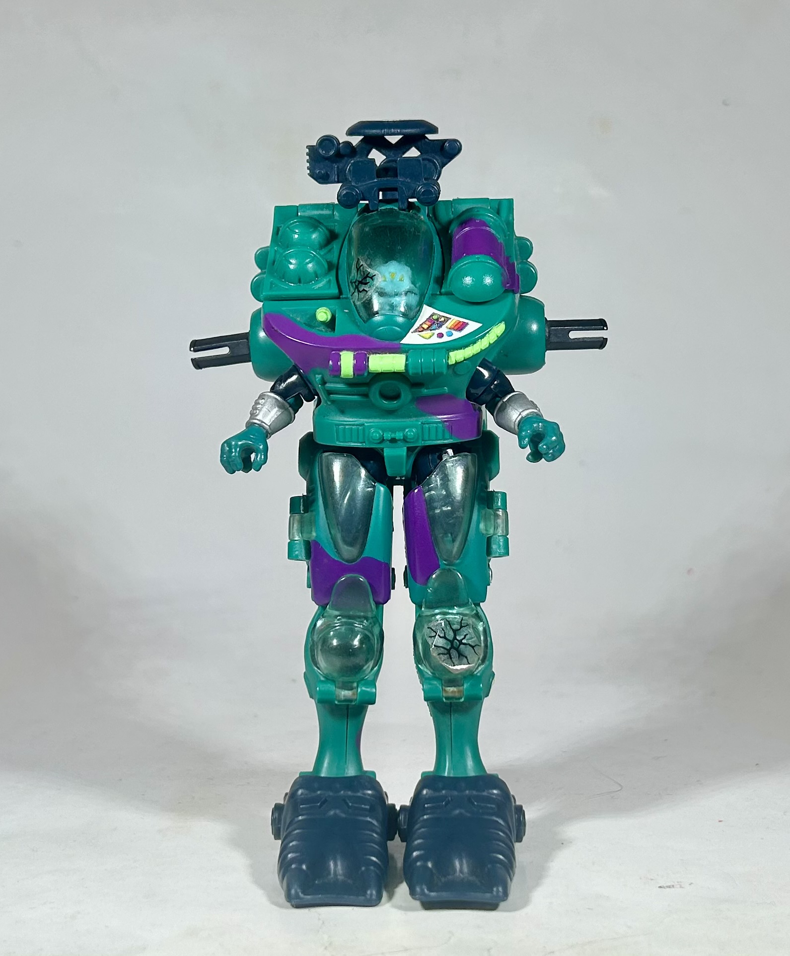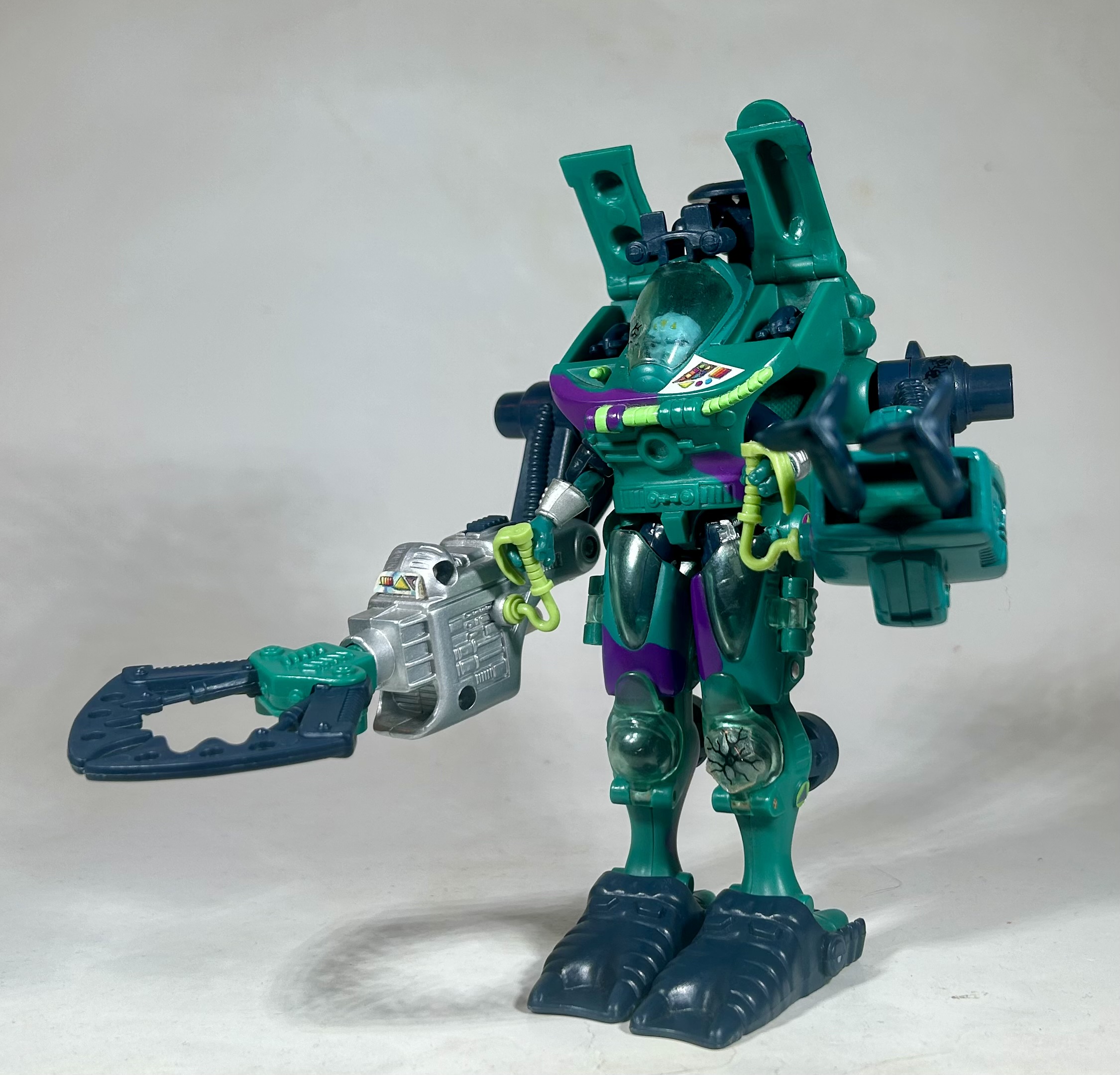 Now, we’re finally getting to the E-Frame itself. Much like its pilot, this battle machine has a glorious color scheme. The 1995 Exosquad Deep Submergence E-Frame is cast in a beautiful aqua/teal plastic with purple camouflage splotches. These are two of my favorite colors and they work wonderfully together. It really has a “late Generation 1 Decepticon” type of vibe that I can’t get enough of.