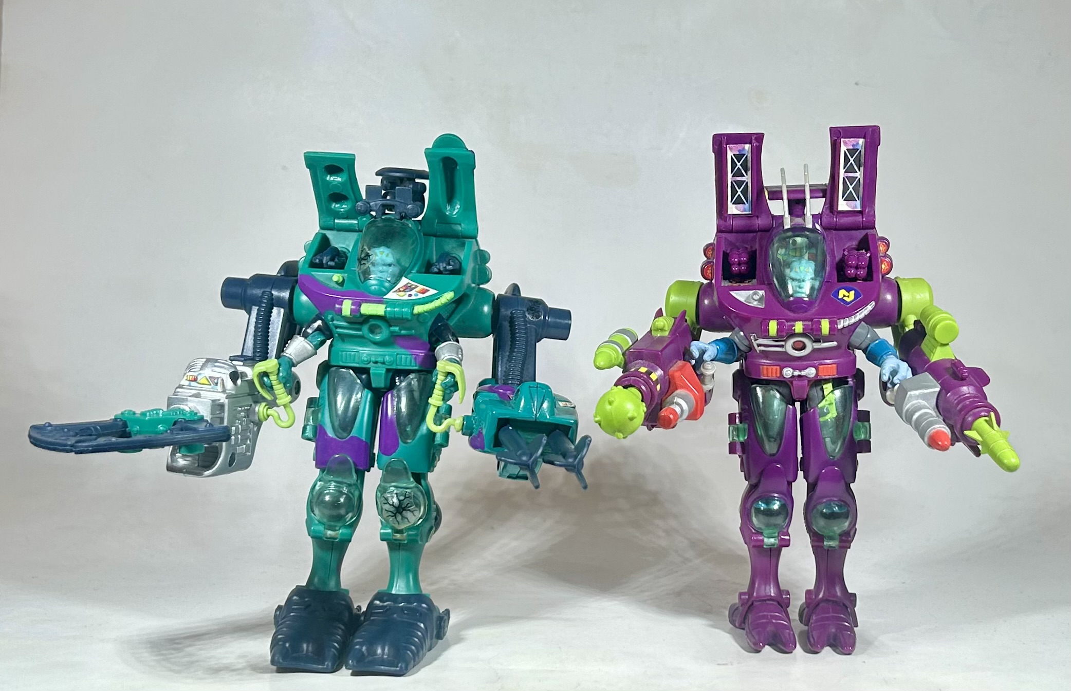 And just for fun, here they both are alongside the 2001 Tech Wars SHOC Infantry tech suit. An extra Exowalking E-Frame Marsala is piloting my Tech Suit, as Tech Wars figures are very fragile at the elbow joint, so I don’t handle them very often.