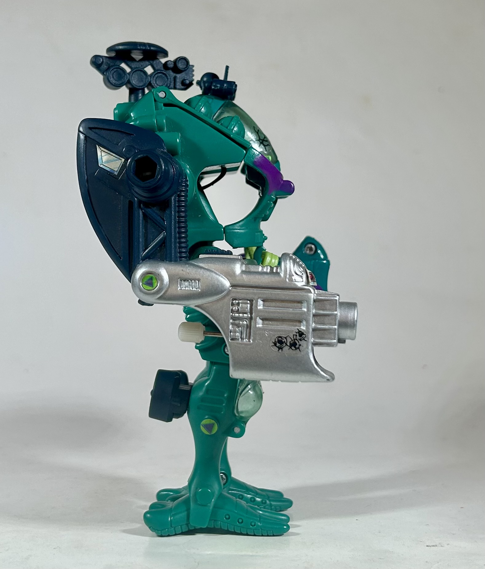 Then you’re left with this. An armless E-Frame looks pretty weird, but it’s all in service of the gimmick. As a kid, I had fun using this feature as “battle damage.” This toy represented my Neosapien army after all, so it wasn’t rare for a generic Neo infantry unit to get its arm blown off by Bronski, O’Reilly, or DeLeon.