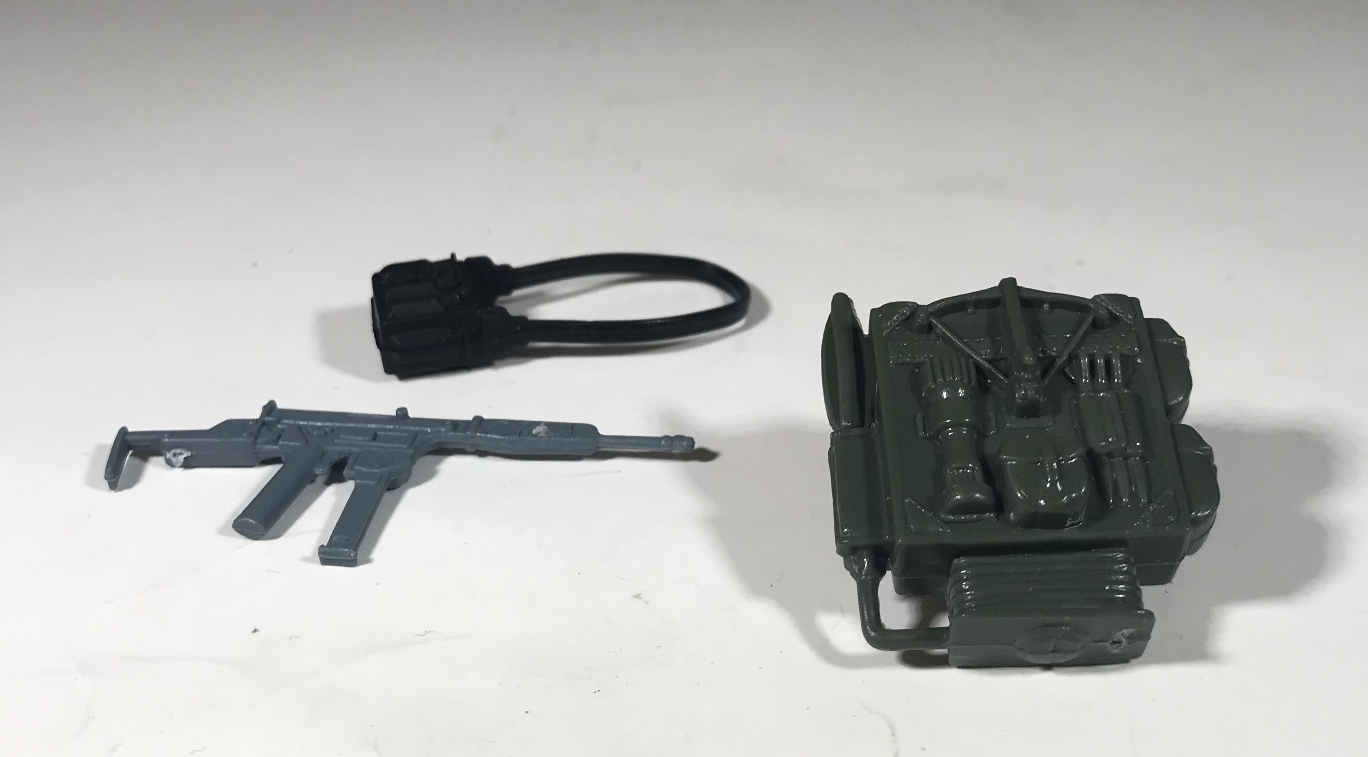 Russian Funskool GI Joe Beach Head includes a dark greenish-grey backpack, a grey submachine gun, and a black ammo pouch (made of a rubbery material).