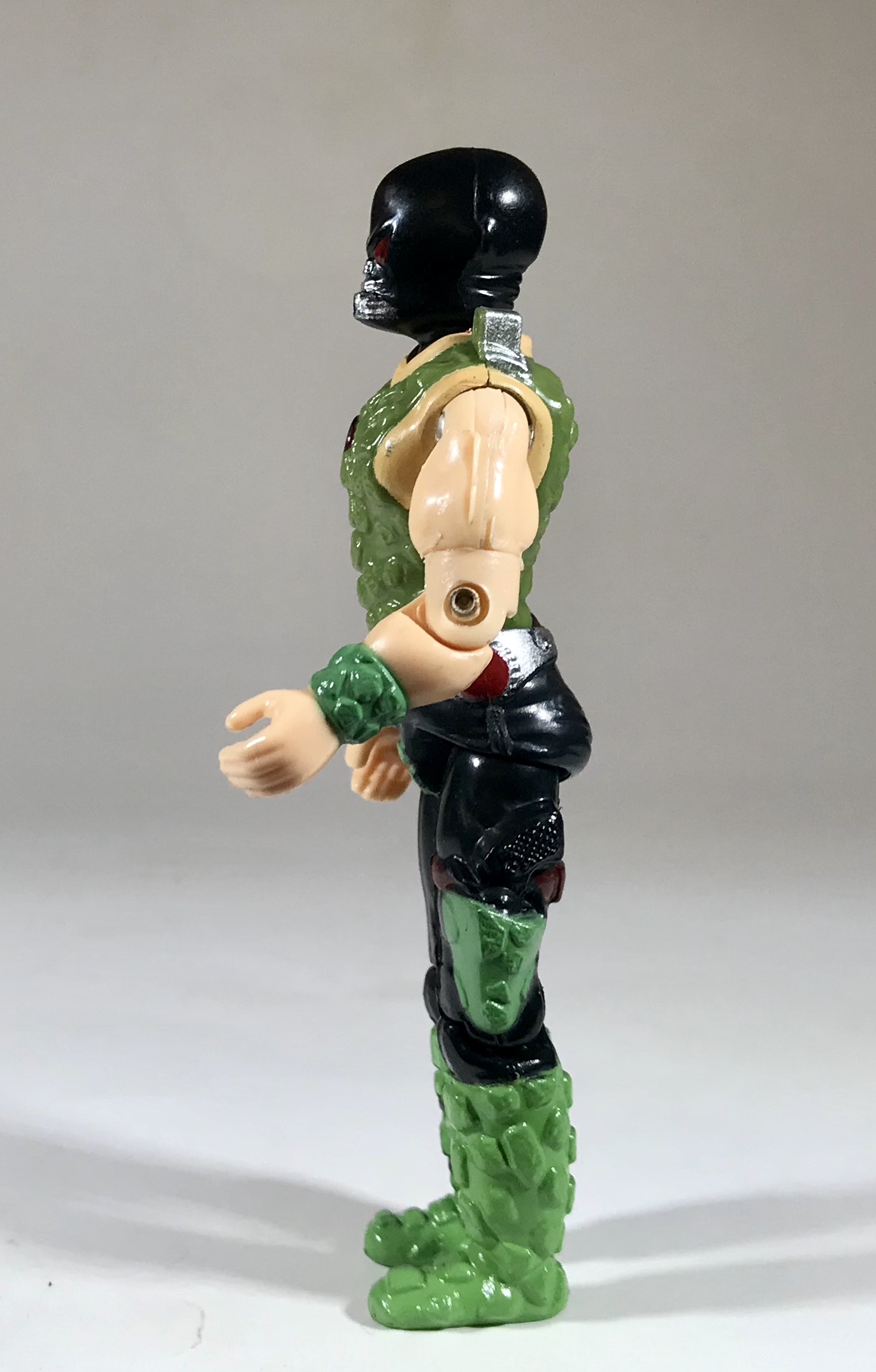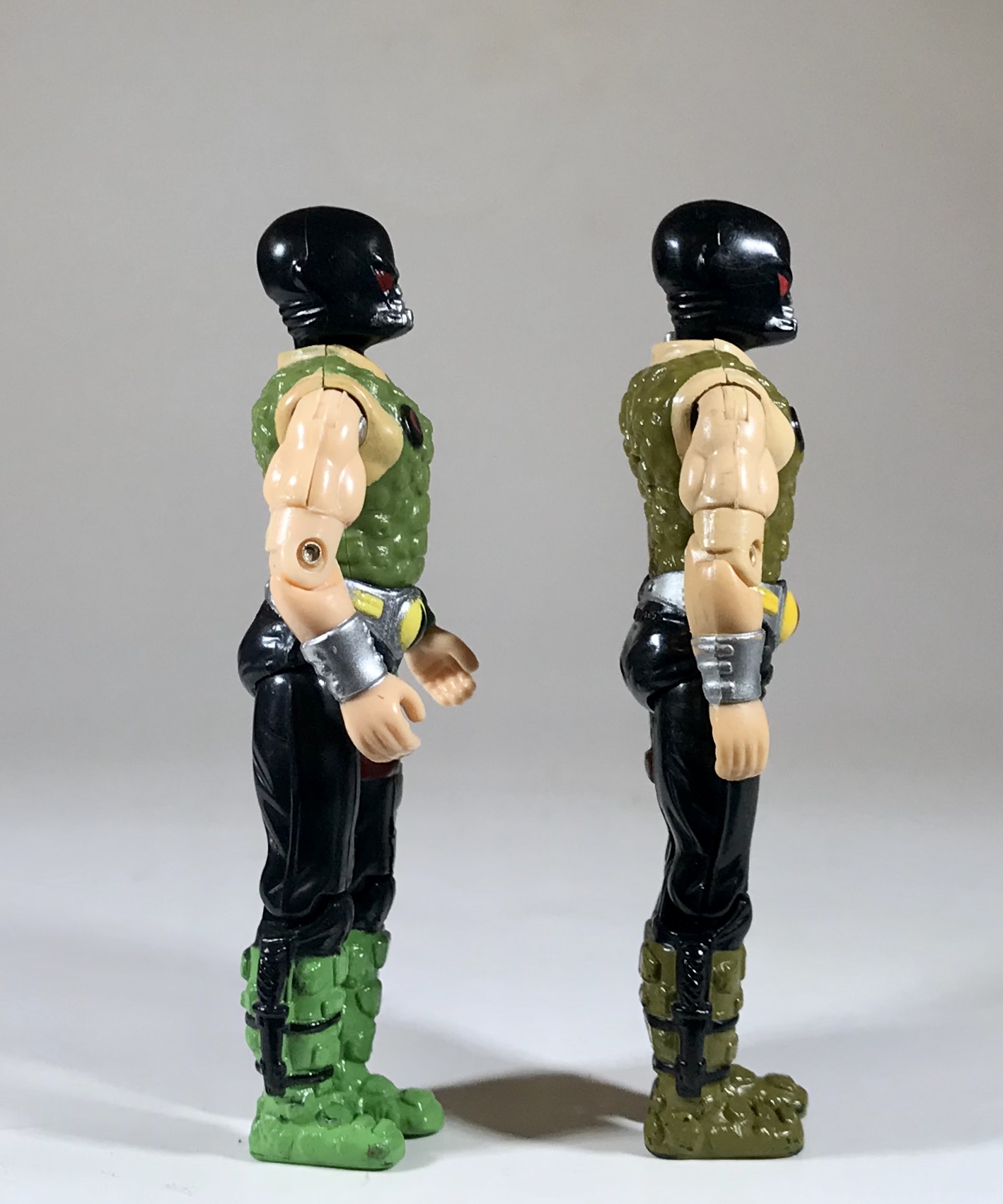 The Russian Funskool GI Joe Croc Master uses a much lighter, brighter green than the Hasbro version. The brown paint is also darker and the yellow paint is also duller. In addition, the red paint (especially for the eyes) isn’t applied as thickly, so it doesn’t stand out quite as much as the eye paint on the Hasbro version does.