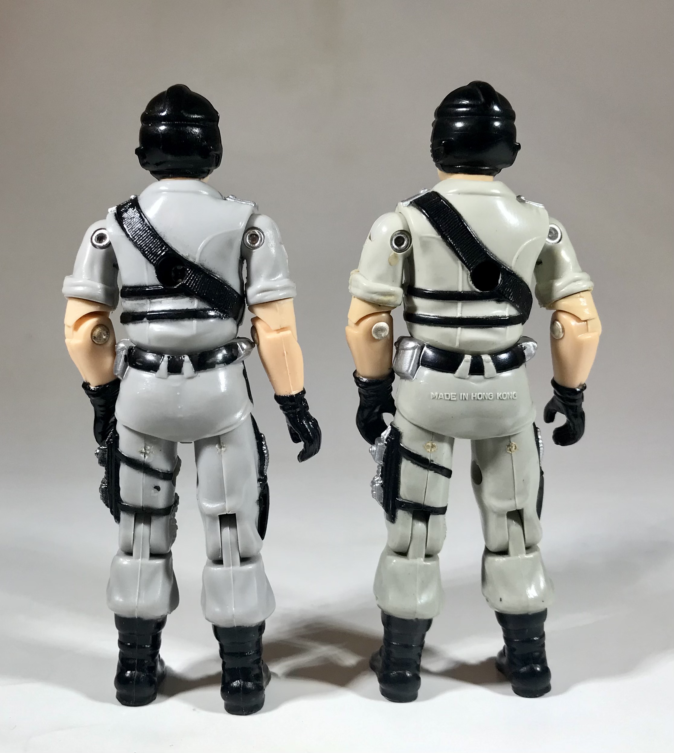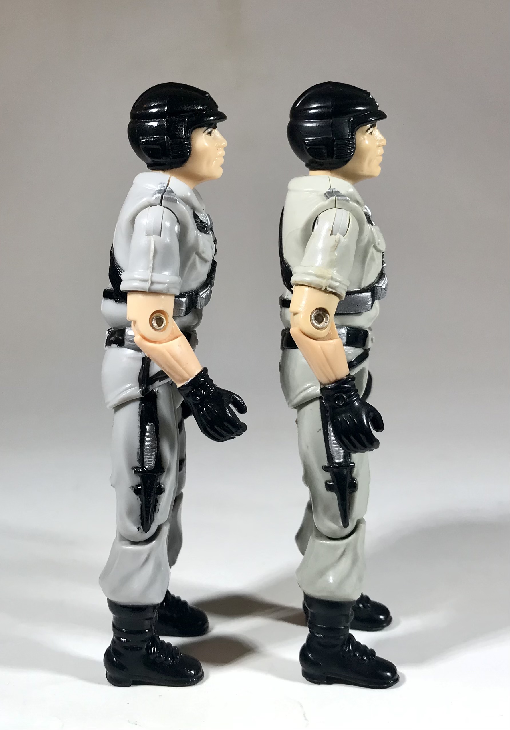 Some, but not all, Russian Funskool GI Joe figures used plastic t-hooks to hold their bodies together, instead of the usual metal t-hook. This figure originally included a plastic t-hook, which shattered under pressure from the figure’s rubber o-ring while it was still in the package.