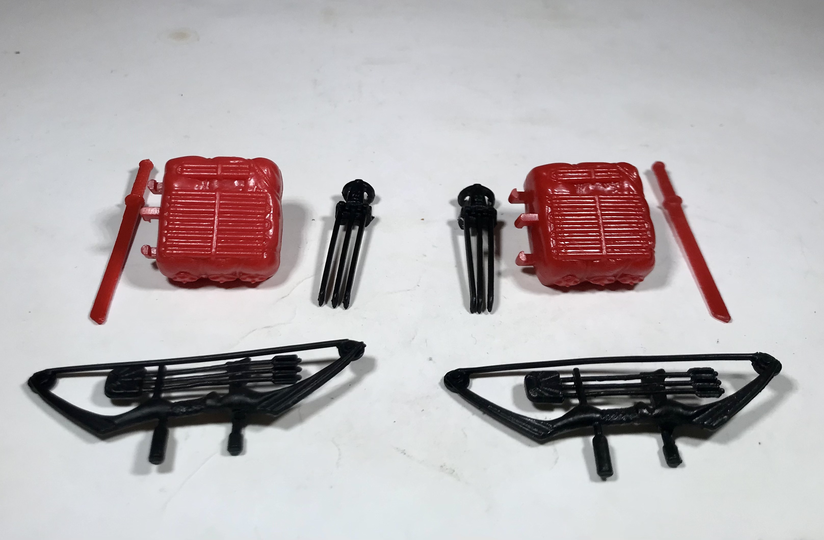 Russian Funskool Storm Shadow includes a red backpack with notches to sheathe the sword, a red sword, a black compound bow, and a black claw.