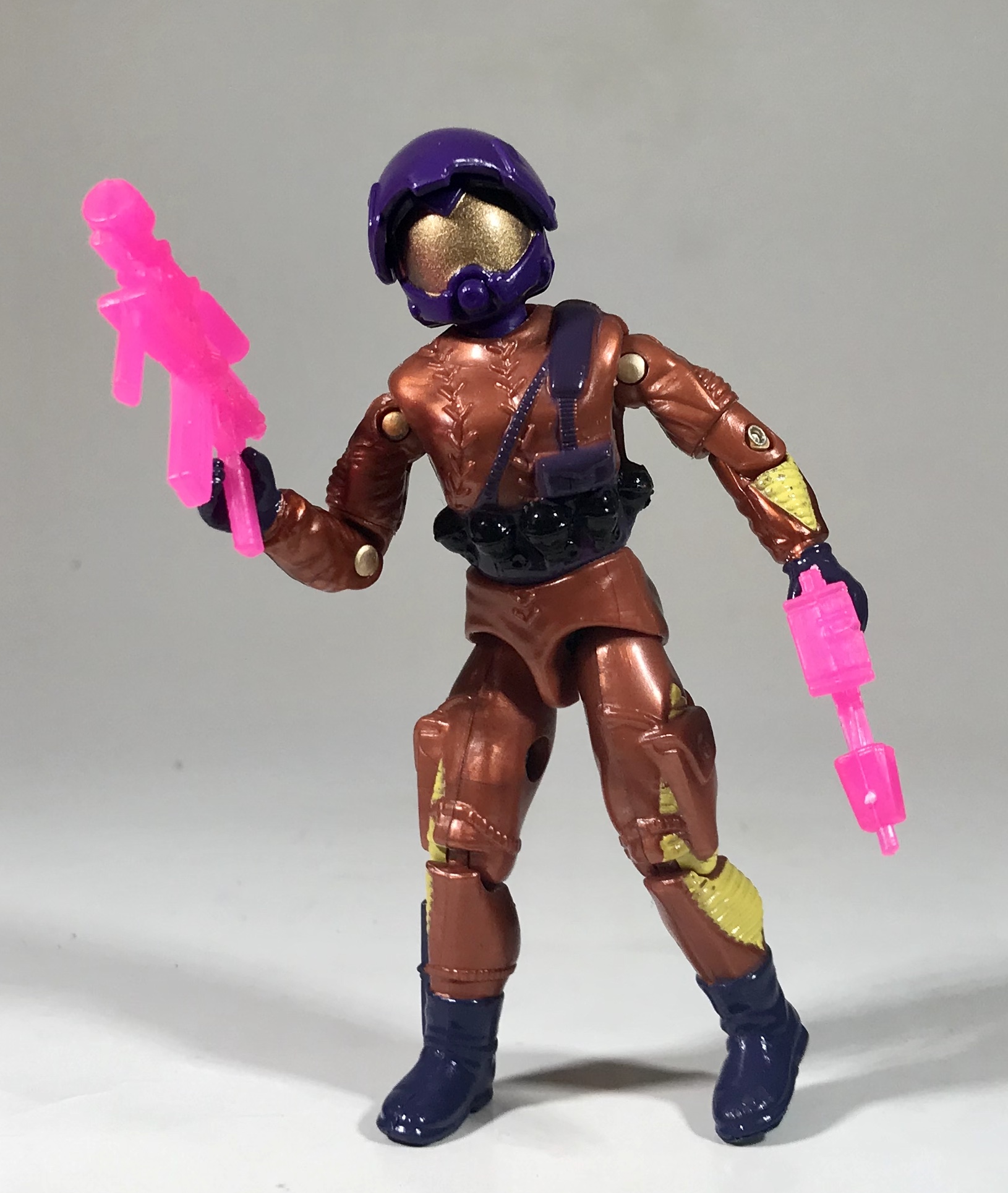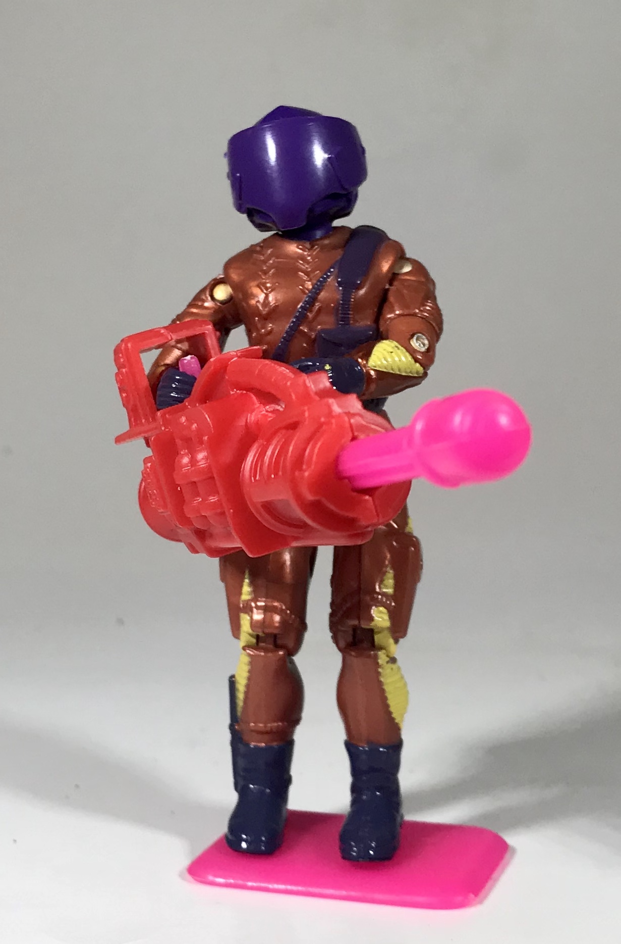 The figure includes the 1988 Iron Grenadier’s laser pistol, 1989 Annihilator’s submachine gun, and 1990 Rock Viper’s rifle in neon pink. The same pink plastic is used for its two missiles and figure stand.